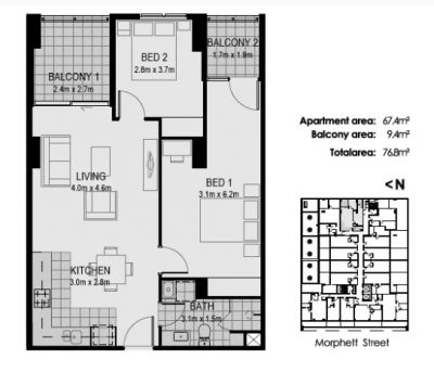 The kitchen is well equipped with solid benchtops, 2-pac cabinetry, stainless steel appliances with gas cooktop, electric oven and dishwasher. There are two bedrooms both with built in robes, the large main bedroom with a generous study nook and direct access to the second private balcony.